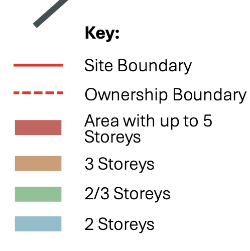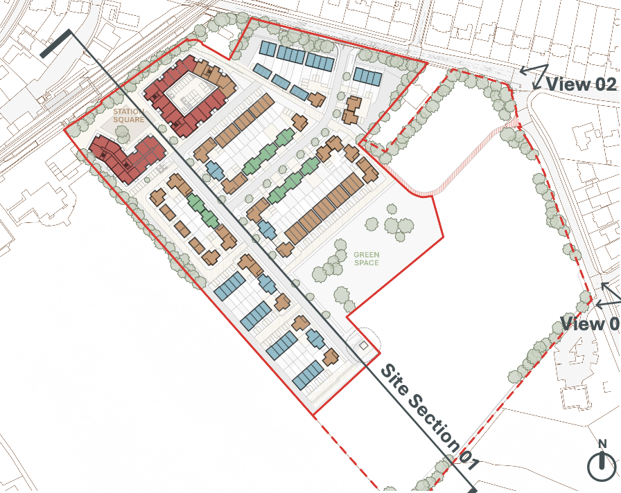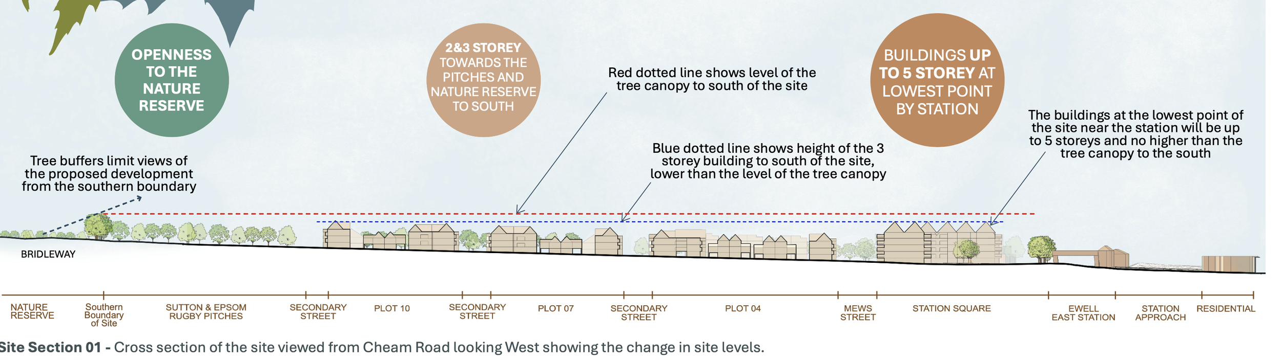 The site slopes down from the Sutton & Epsom Rugby pitches towards the station with a total drop of 12.5m. Thick buffers of trees are present around the boundary to the site to the south, north, and east. These will limit views into the site, and the building heights are proposed so that they will sit below the tree canopy.