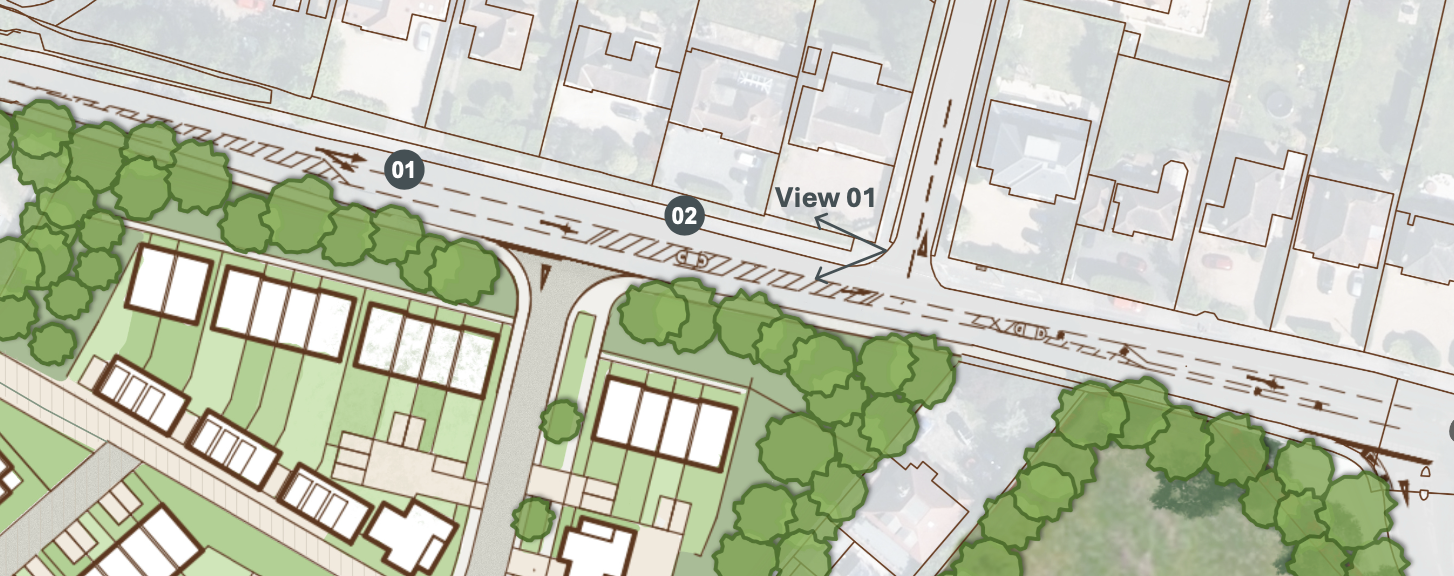 View 01 - Indicative view northbound towards railway bridge showing new frontage to Cheam Road set back to retain and enhance landscape edge